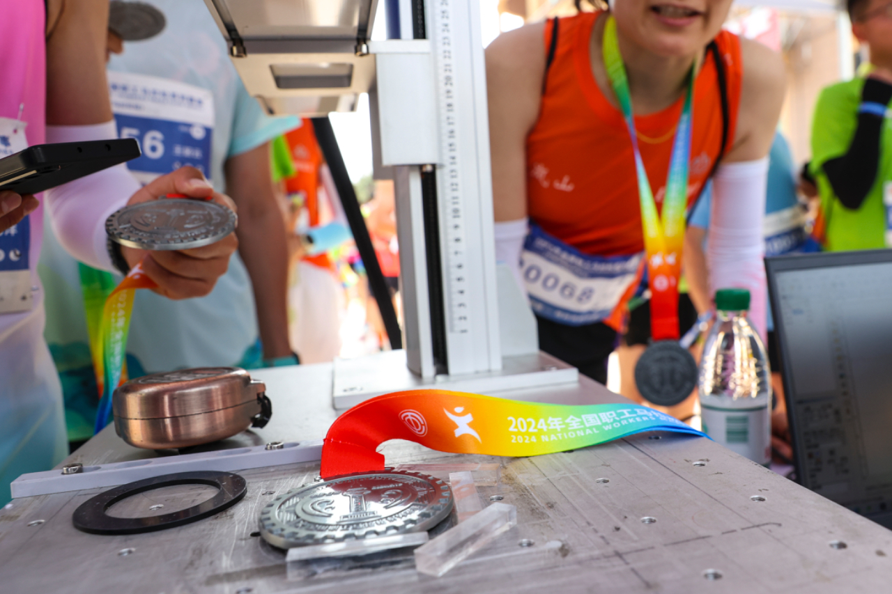 5月19日,山东日照,赛后参赛者们在官方指定位置排队,将自己的名字和比赛成绩雕刻在奖牌上。