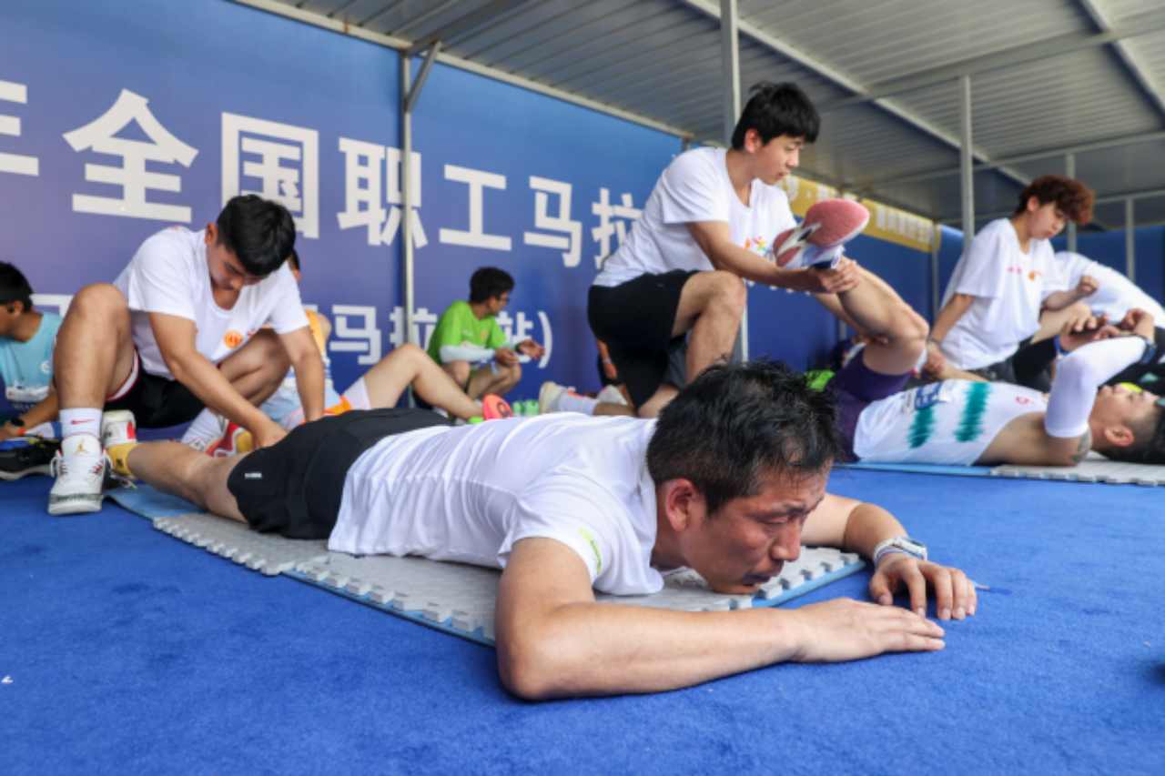 5月19日,山东日照,2024年全国职工马拉松系列赛事(日照半程马拉松站)终点拉伸区,赛后参赛者们在志愿者的帮助下进行肌肉放松。