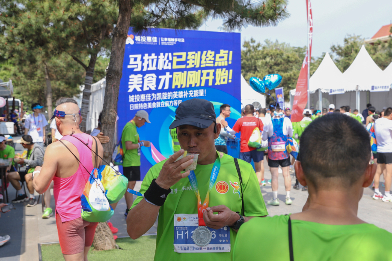 5月19日,山东日照,赛后参赛者品尝日照美食补充能量。