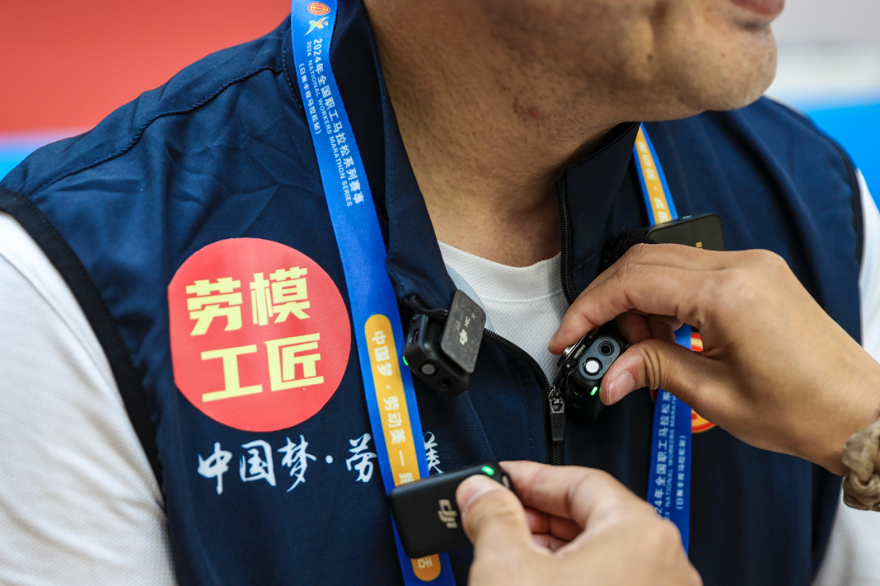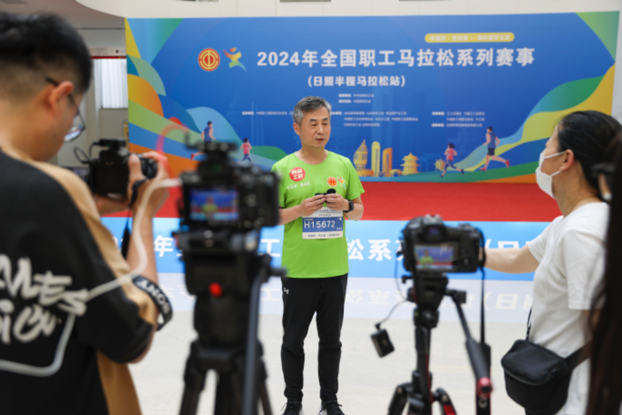 5月18日,山东日照,2024年全国职工马拉松系列赛事(日照半程马拉松站)开幕仪式前,劳模参赛者接受媒体采访。