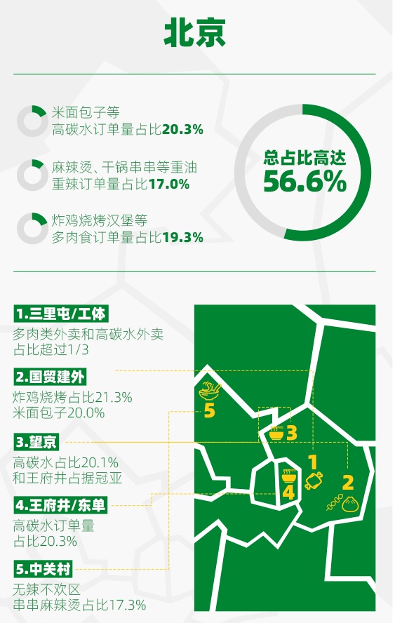 北京是三地中选购高碳水食物最多的地区,外卖订单量占比高达20.3%。