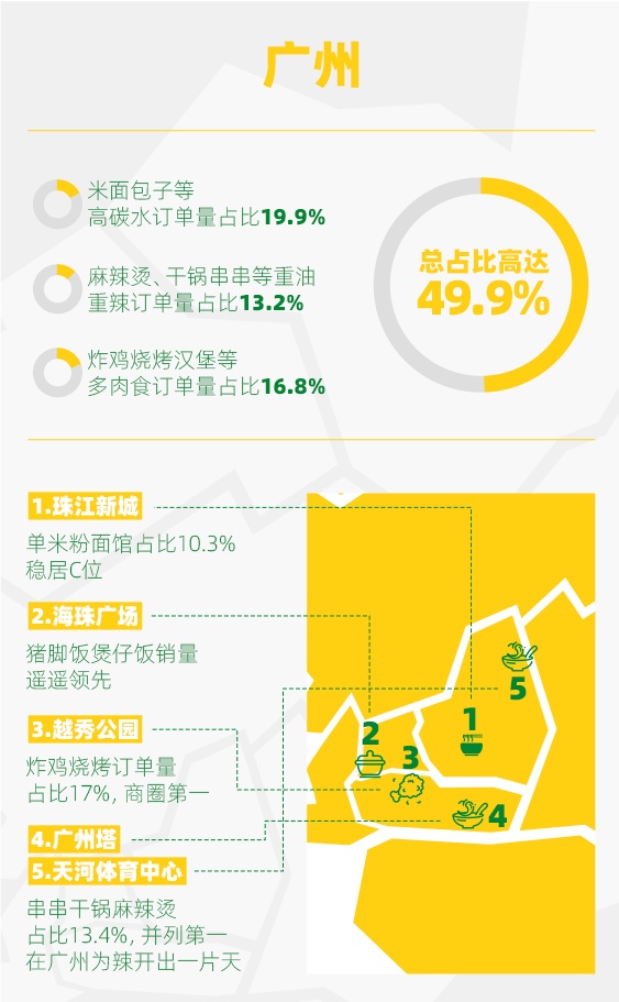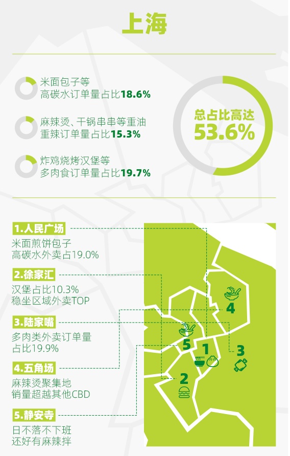《报告》以北京、上海、广州三地,共15个CBD(中央商务区)为例,调查了职场上班族的外卖选择。对于北上广三地的职场人来说,人们在进行外卖选择时更偏好重口味、高碳水和肉类食物。