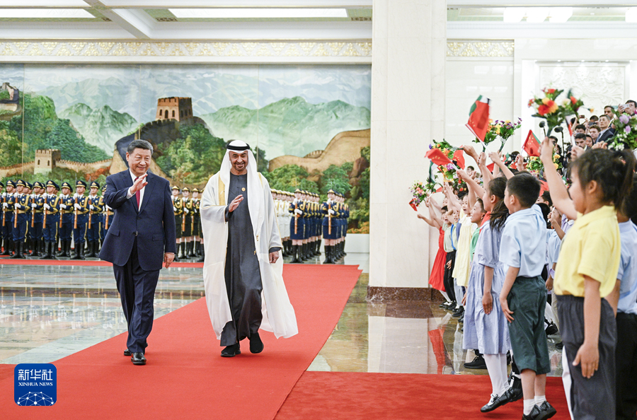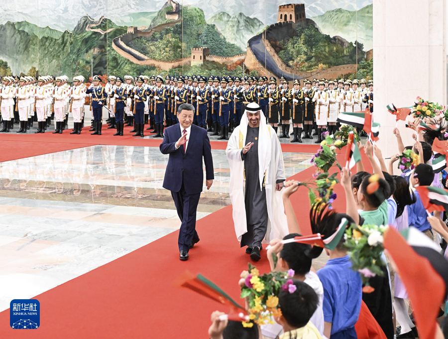 5月30日下午,国家主席习近平在北京人民大会堂同来华国事访问并出席中国-阿拉伯国家合作论坛第十届部长级会议开幕式的阿联酋总统穆罕默德举行会谈。这是会谈前,习近平在人民大会堂北大厅为穆罕默德举行欢迎仪式。