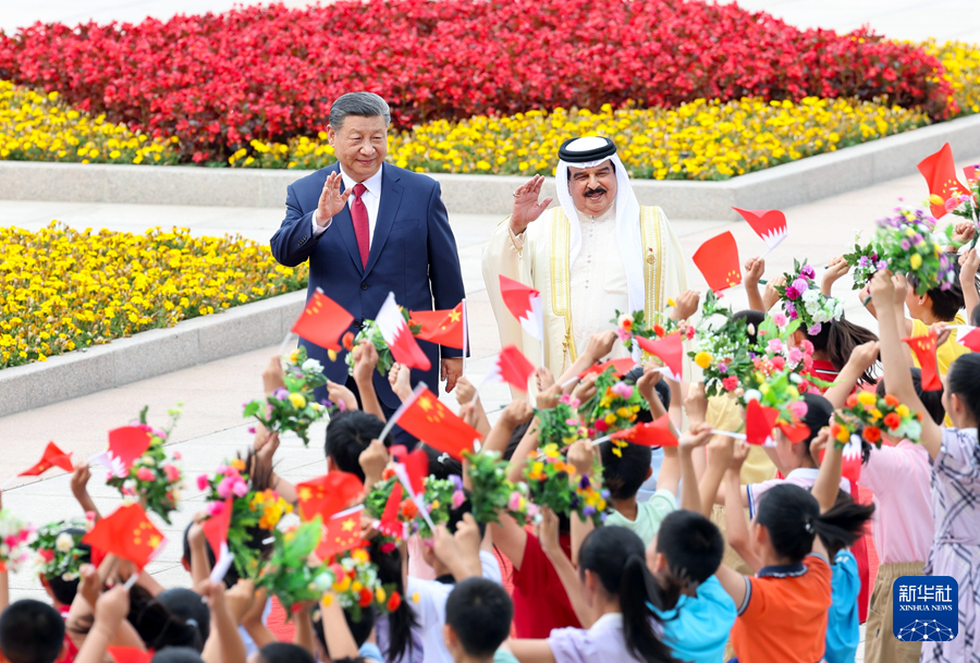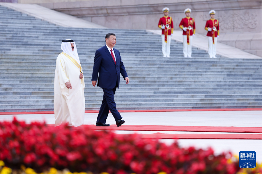 5月31日下午,国家主席习近平在北京人民大会堂同来华国事访问并出席中阿合作论坛第十届部长级会议开幕式的巴林国王哈马德举行会谈。这是会谈前,习近平在人民大会堂东门外广场为哈马德举行欢迎仪式。