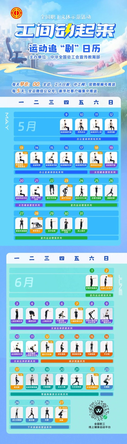 全国总工会宣教部近期上线“工间动起来”——职工健身短视频,供广大职工工间锻炼使用,包括肩颈放松、健身塑型、全身拉伸、跑步燃脂等七个系列。