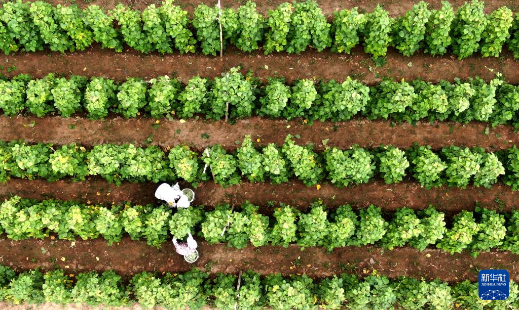 6月4日,菜农在河北省石家庄市栾城区南安乐村菜园里采收豆角(无人机照片)。新华社发(李明发 摄)