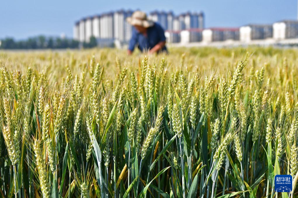 6月4日,农民在山东省烟台市农科院小麦试验田里锄草。新华社发(孙文潭 摄)