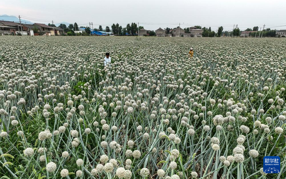 6月4日,河南省济源市克井镇农民在洋葱制种田里进行管护作业(无人机照片)。新华社发(苗秋闹 摄)