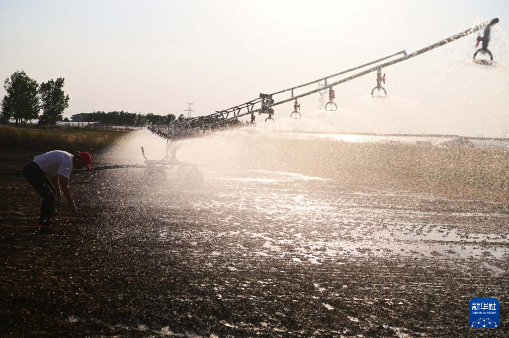 6月3日,在山东省聊城市东昌府区梁水镇镇东苏村,农民对新播种的玉米进行浇灌。新华社发(张振祥 摄)