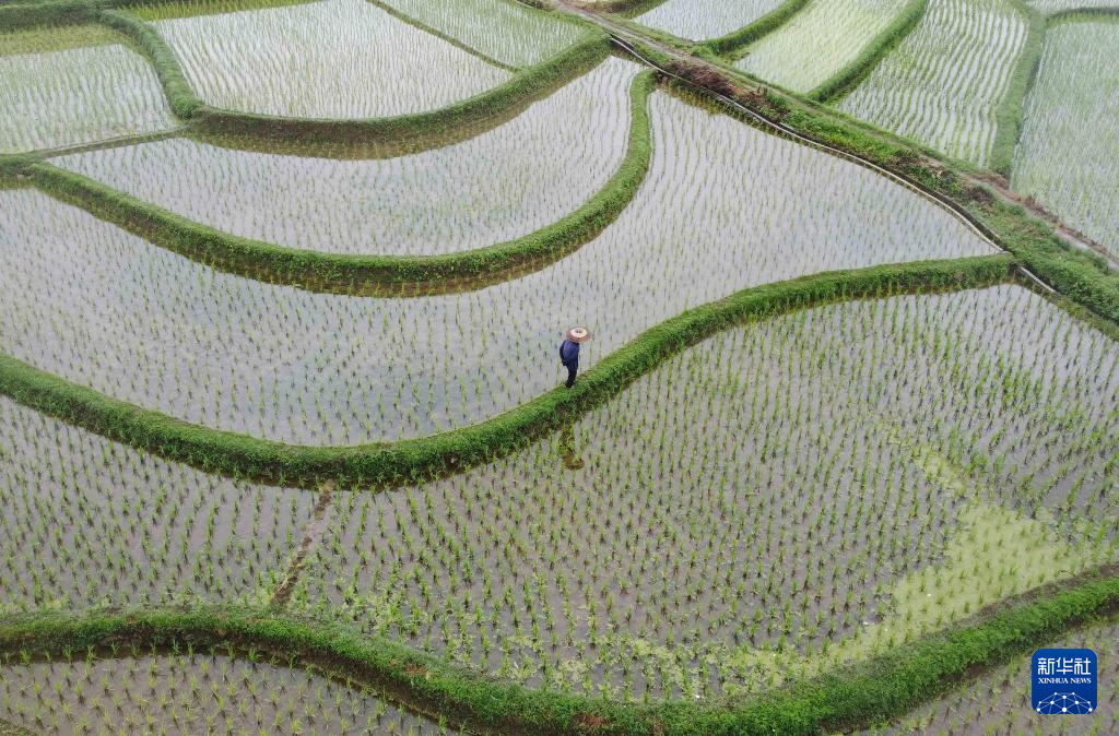 6月4日,贵州省黔东南苗族侗族自治州施秉县杨柳塘镇望江村村民在田间查看水稻秧苗长势(无人机照片)。新华社发(邰胜智 摄)