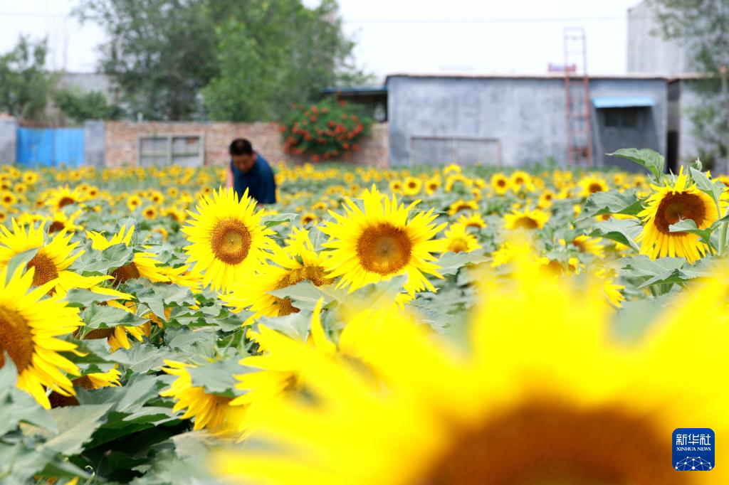 6月4日,在山东省聊城市茌平区温陈街道王庙村,农民在管护油葵。新华社发(马红坤 摄)
