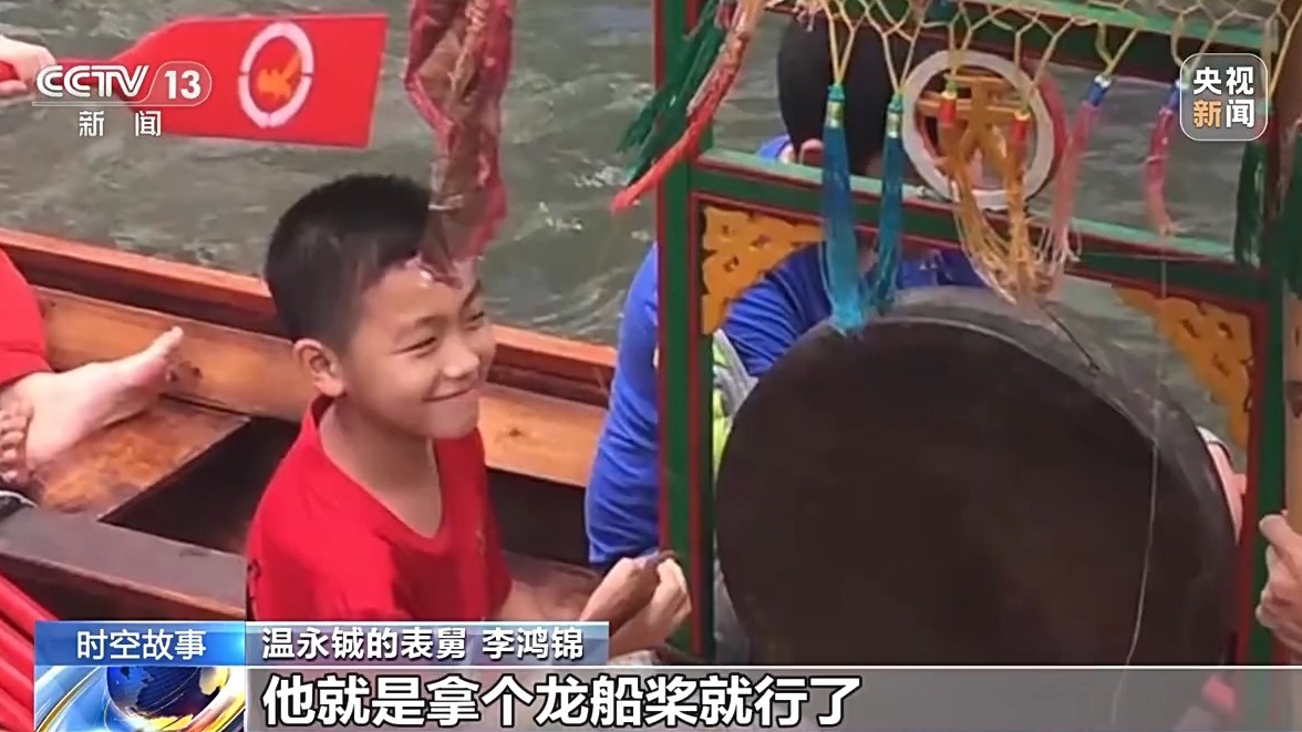 温永铖的表舅 李鸿锦:从小我就带他下龙船的,人家玩具都是玩汽车什么的,他就是拿个龙船桨就行了,自己坐在那个水盆上,他也学划龙船的样子。