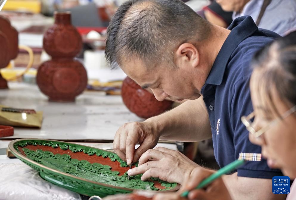 朱江设计的实用性雕漆工艺品(6月5日摄)。