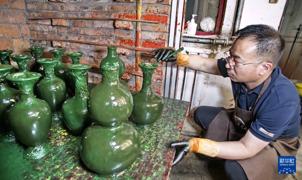朱江在雕漆工作室观察荫干室中髹漆后的瓶胎(5月30日摄)。