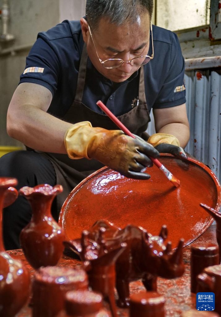 朱江在雕漆工作室对木胎盘子进行反复髹漆(5月30日摄)。