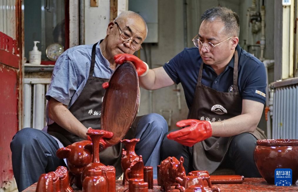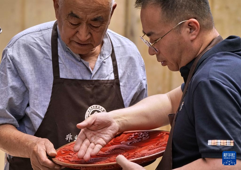 朱江(右)和父亲朱庆元在雕漆工作室研究髹漆过程中的问题(5月30日摄)。