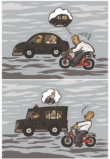 骑自行车的人羡慕坐小汽车的,这是人之常情;再往下看,小汽车还有专人驾驶,这就不免令人心生嫉妒了;再看坐车那主儿,看他那不把人放在眼里的眼神儿,恨也便不声不响地冒出来了。恨,一经出现,由恨而生的假设也便随之而来。“想想,就他这副德行,这车能是好来的吗?”接下来,种种推测,抢劫、诈骗、贪污、贩毒,能想到的都想了一遍。总之,这家伙迟早得“进去”。