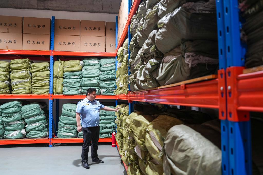 6月18日,在湖南省长沙市天心区防汛物资仓库,应急管理局工作人员在检查防汛物资。新华社记者 陈思汗 摄