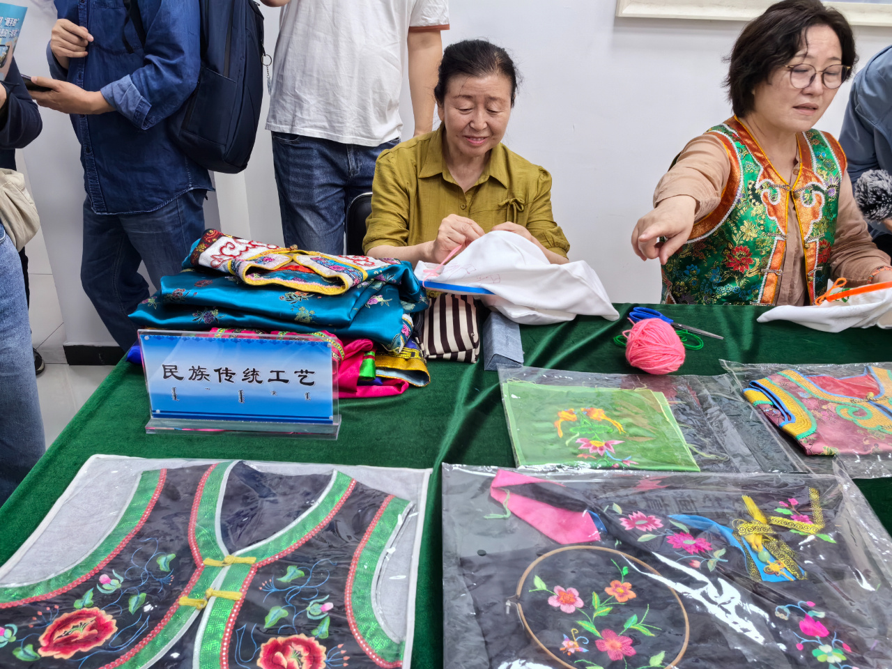 民族技艺传承区里,不少居民在此学习刺绣、编织等手工技艺,据悉,这里的民族技艺培训班由前几年的5人增加到了20余人。墙上的一幅《草原儿女心向党》绣品格外醒目,是社区各族居民用十字绣及蒙绣两种针法制作而成的。