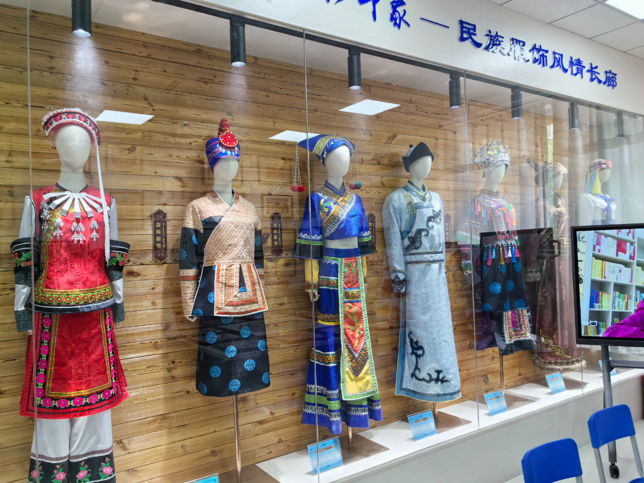 小课桌旁边的民族风情展厅,展示了12个少数民族的服饰和生活用品,帮助促进社区各民族居民相互了解。