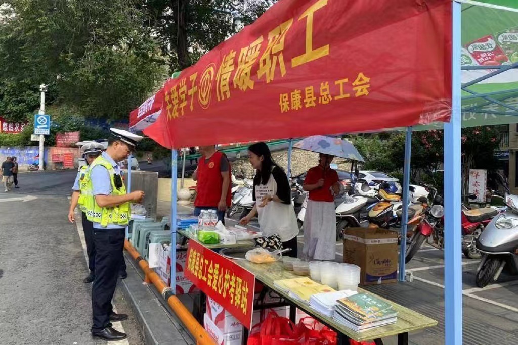 “来,喝碗绿豆汤,娃子考试一路亮绿灯!”在襄阳保康县,工会驿站将服务窗口延伸到考点前,设立爱心助考站台,为考生家长以及服务中考的公安民警、老师精心准备“清凉包”,提供矿泉水、雨衣、藿香正气口服液、清凉油、绿豆汤等防雨降暑物资,温馨祝福与贴心关怀让他们在炎炎夏日中感受到清凉。