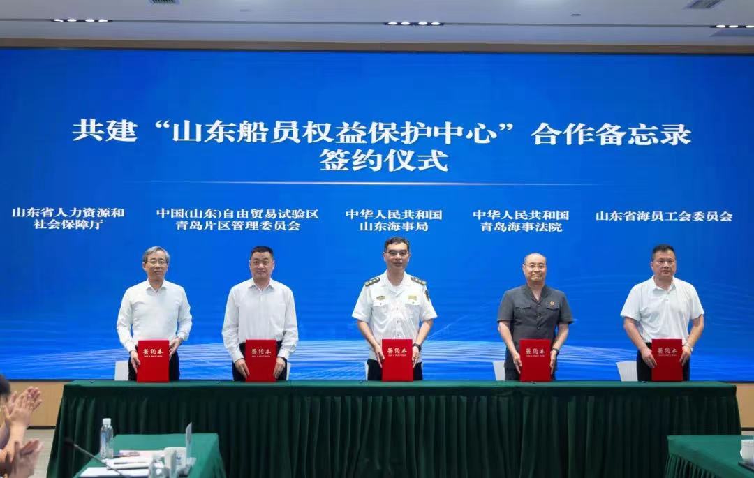 近日,山东海事局、青岛自贸片区管委、青岛海事法院、山东省人力资源和社会保障厅、山东省海员工会委员会共同签署《共建“山东船员权益保护中心”合作备忘录》。旨在为推动各方联合在青岛自贸片区共建“山东船员权益保护中心”,优化船员职业发展环境,高效维护船员合法权益,巩固和发挥山东船员大省优势,打造“山东船员”品牌,为海洋强国、航运强国建设提供重要支持保障。
