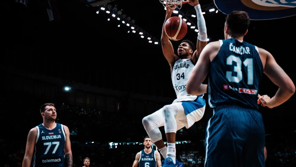 希腊队于斯洛文尼亚队在比赛中(国际篮联官网)