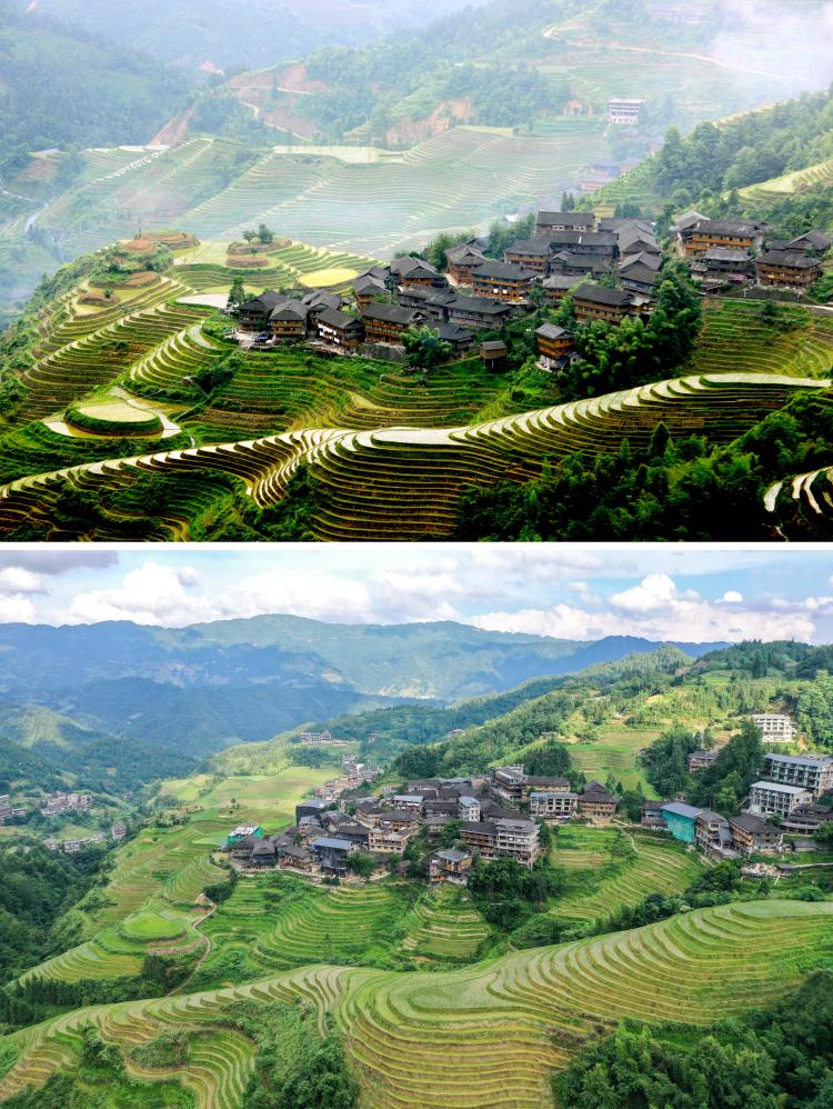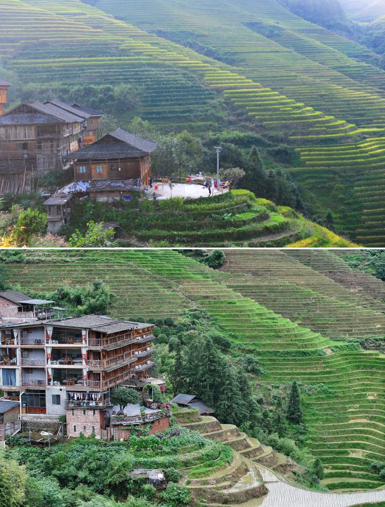拼版照片:这是2013年(上图,资料照片)和2024年拍摄的大寨村民宿和梯田(下图,新华社记者曹祎铭摄)。从照片里可以看到,虽然民宿数量有一定变化,但整体的建筑风格仍保持统一。