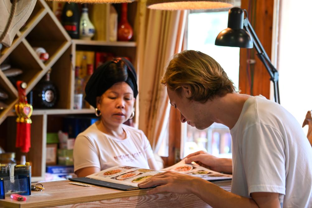 来自德国的游客在大寨村一家民宿点菜(6月26日摄)。