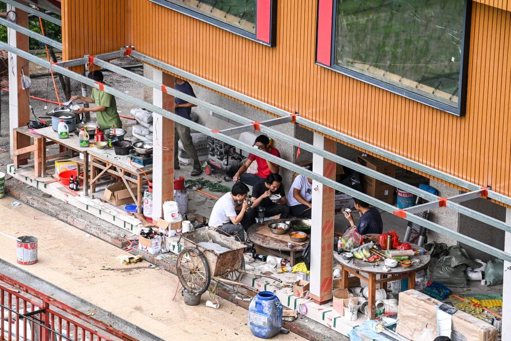 在大寨村一处建设中的民宿施工现场,工人们聚在一起吃午饭(6月26日摄)。