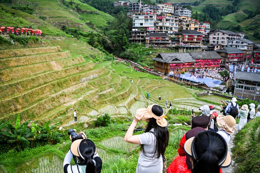 7月11日,游客在大寨村参加当地传统“晒衣节”。