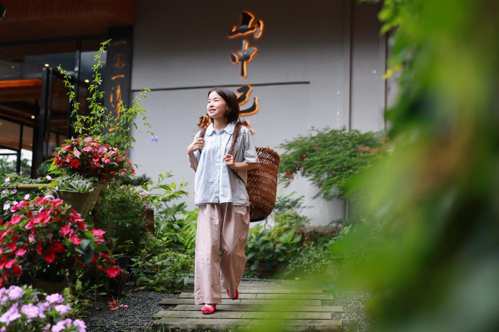 在大寨村“山中已千年”观景民宿,一名来应聘的大学生背着筐外出(6月26日摄)。