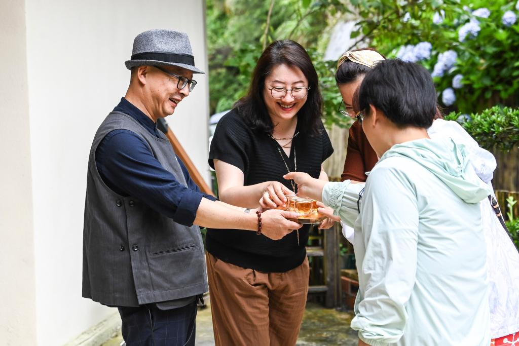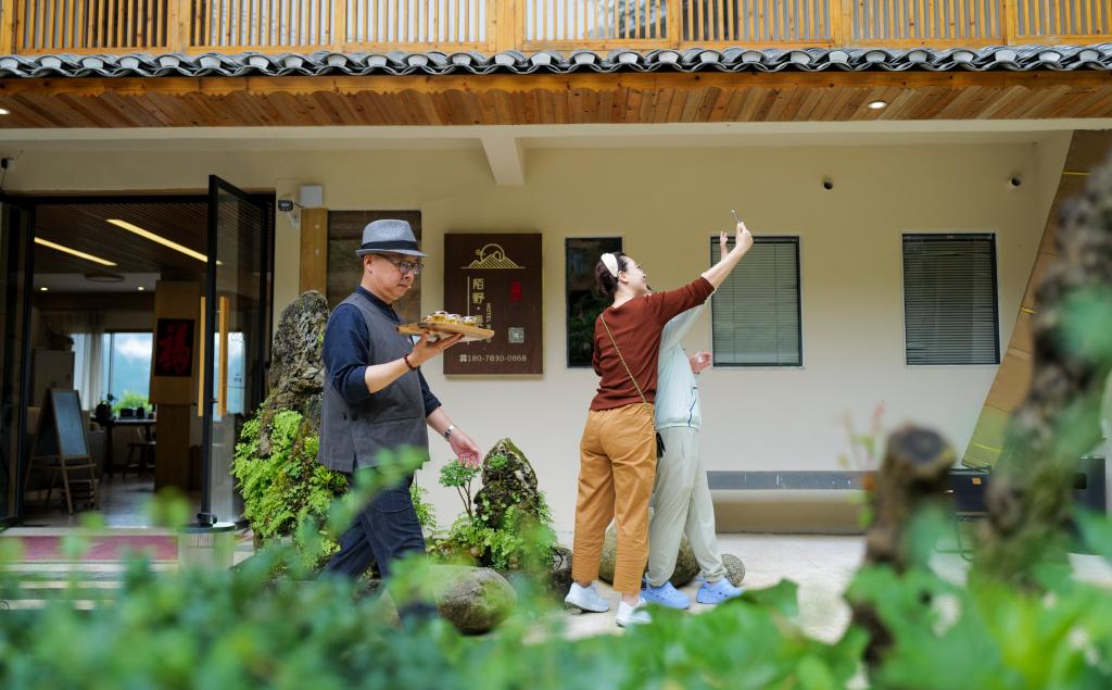 大寨村“陌野·晨曦”民宿管家李滨(左一)为入住的客人送茶水(6月26日摄)。
