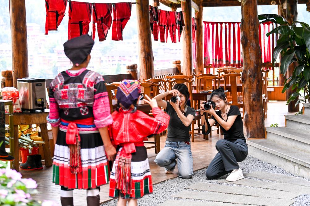 7月11日,在大寨村“山中已千年”观景民宿,两名刚毕业的大学生应聘到此工作,为游客拍照。