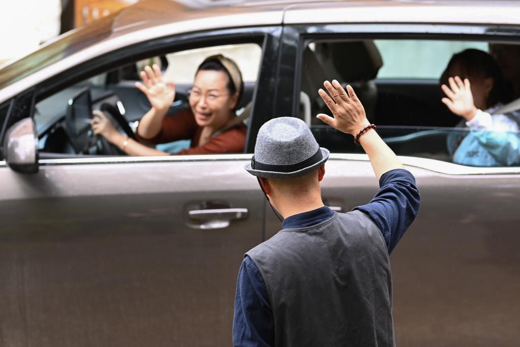 大寨村“陌野·晨曦”民宿管家李滨与游客挥手告别(6月26日摄)。