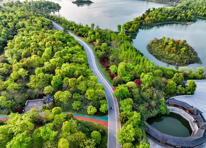 这是2022年4月5日拍摄的江西省萍乡市萍水湖湿地公园(无人机照片)。萍乡市将治水与绿化相结合,沿萍水河打造萍水湖湿地公园。新华社发(李桂东 摄)