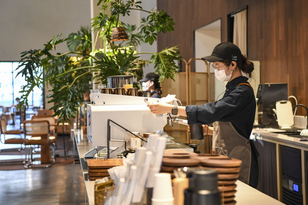 7月15日,重庆市江北区洋炮局1862文创园内的一咖啡馆工作人员在制作咖啡。