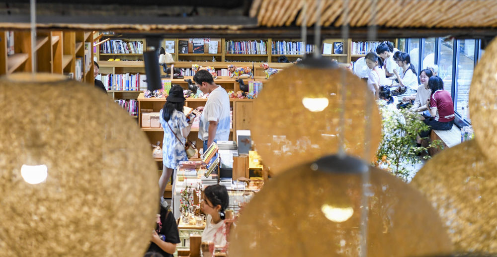7月15日,游客在重庆市江北区北仓文创街区休闲、选购文创商品。