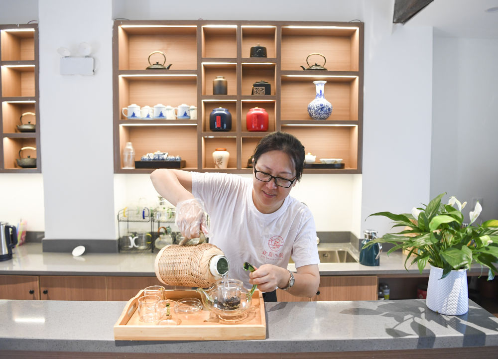 7月15日,重庆市江北区洋炮局1862文创园内的一茶馆工作人员在泡茶。