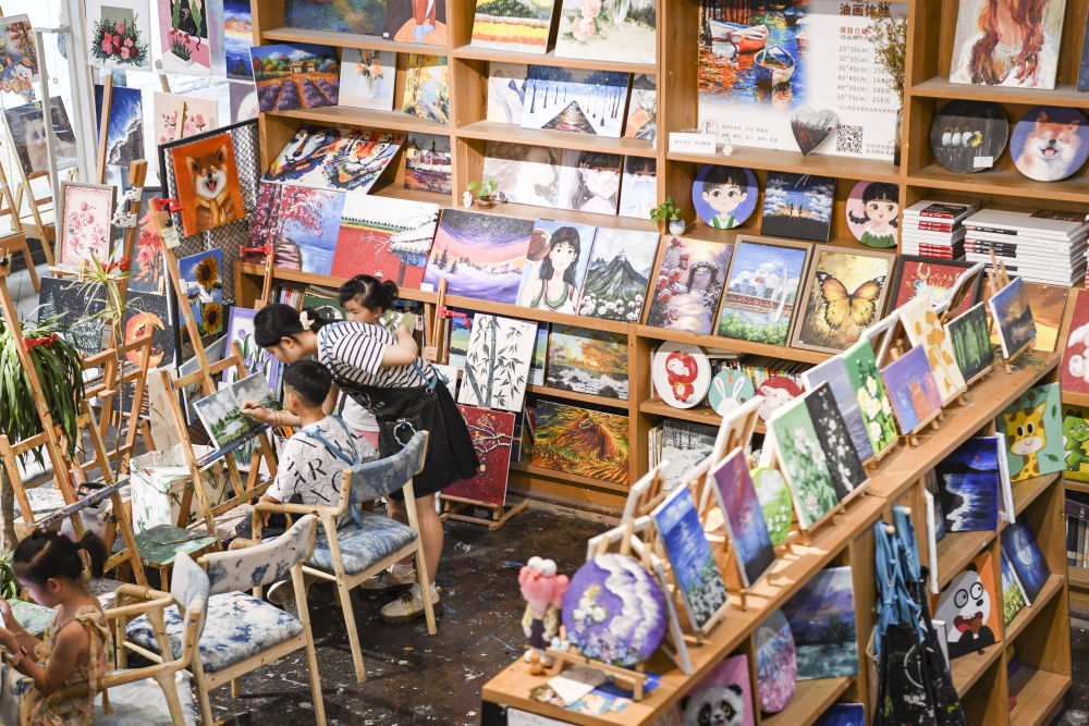 7月15日,游客在重庆市江北区北仓文创街区体验绘画。