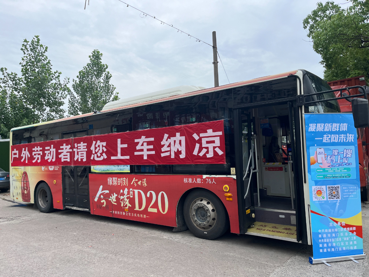 当天,由海门公交集团提供的两辆公交专用“移动的清凉车”在大千商贸城北侧、秀山路拥军路南侧投用。这两辆“移动的清凉车”配备了矿泉水等夏令用品,每天上午10点半到下午3点半,为货车司机以及环卫工人就近送上清凉服务,直至8月下旬结束。货车司机施健红开心地说,“在每天最热的时段,为我们货车司机提供了一个乘凉、休息的好地方!”