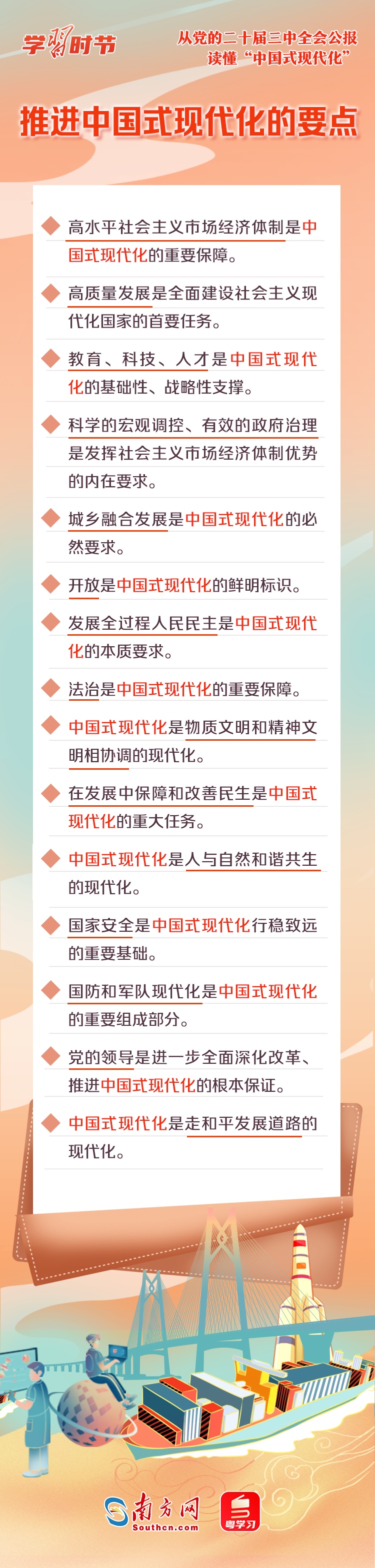 中国式现代化是中国共产党和中国人民长期实践探索的成果,是一项伟大而艰巨的事业。全会公报中,“中国式现代化”一词被反复提及,深刻阐述了进一步全面深化改革与推进中国式现代化的关系,以及中国式现代化的重要保障、必然要求、本质要求等重要内容。一起来学习!