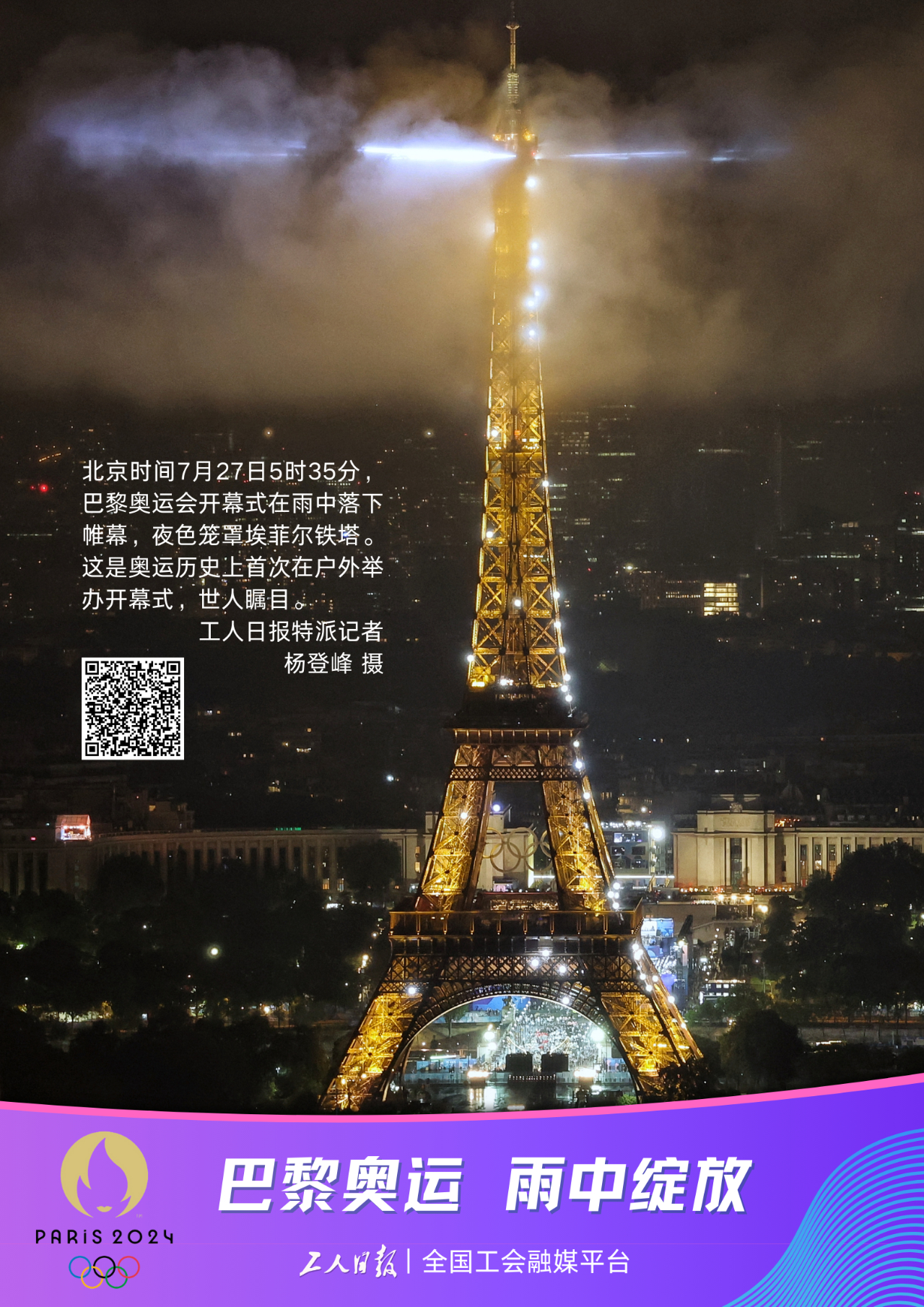 北京时间7月27日5时35分,巴黎奥运会开幕式在雨中落下帷幕,夜色笼罩埃菲尔铁塔。这是奥运历史上首次在户外举办的开幕式,世人瞩目。