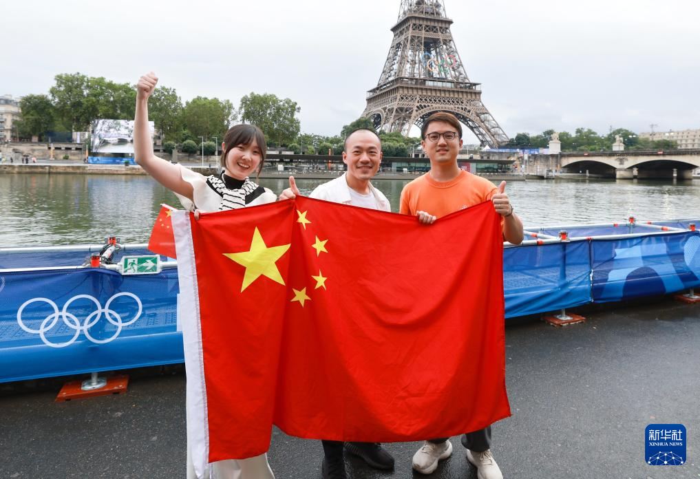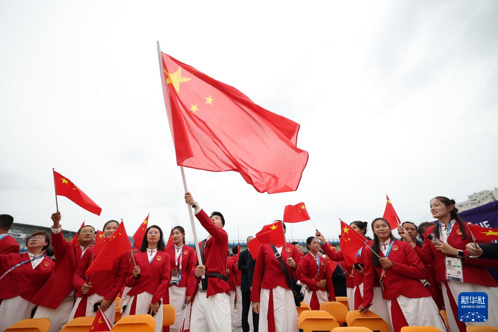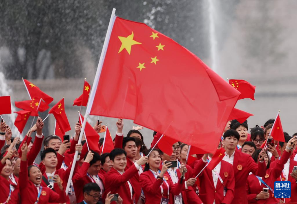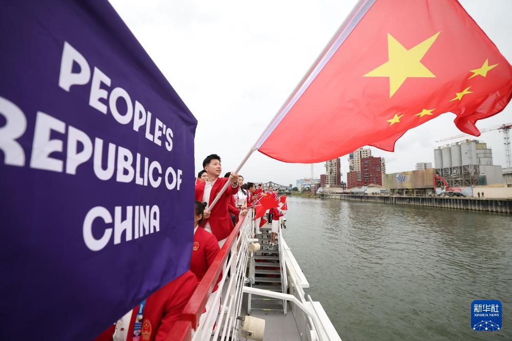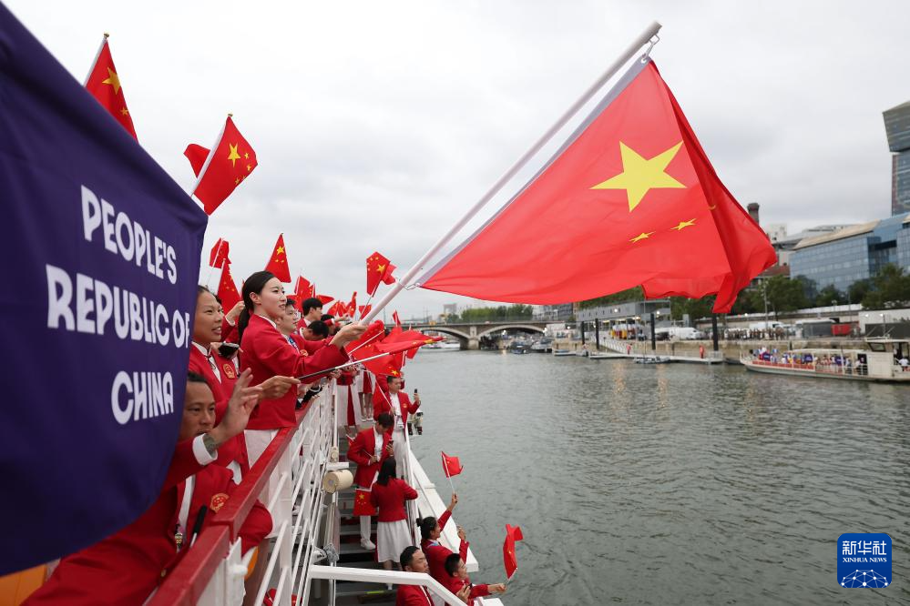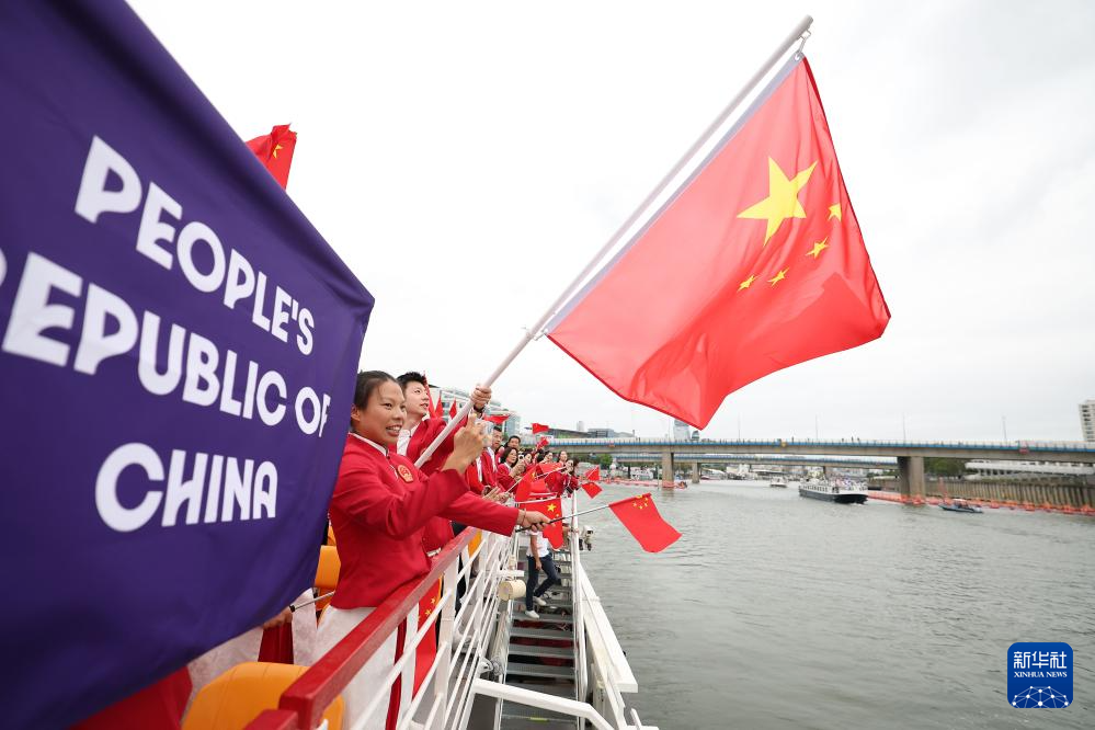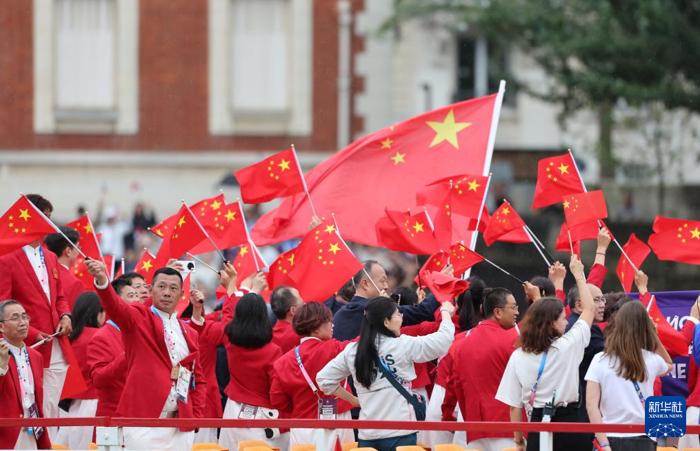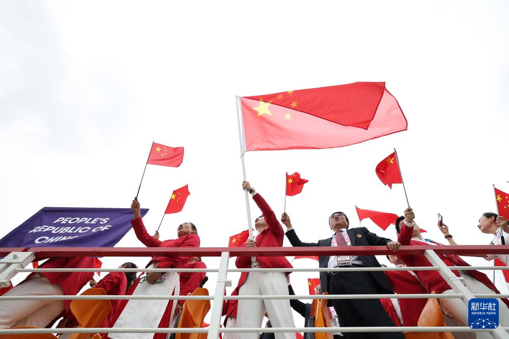 7月26日,中国体育代表团旗手、花样游泳选手冯雨在开幕式上挥舞国旗。新华社记者 曹灿 摄