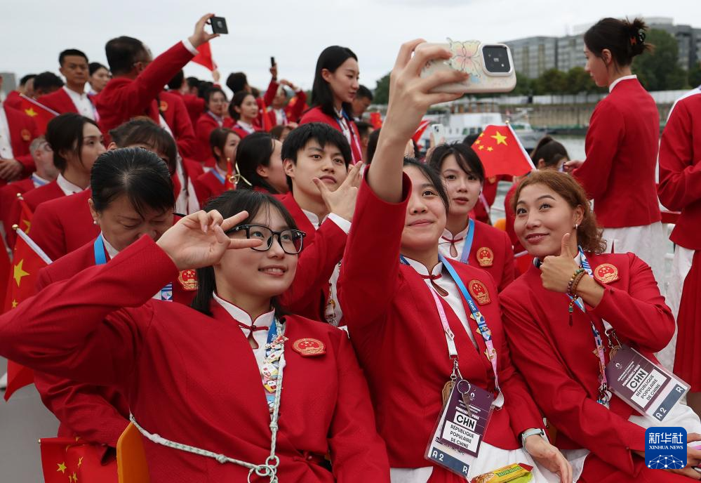 7月26日,中国体育代表团成员在开幕式前自拍留影。新华社记者 曹灿 摄