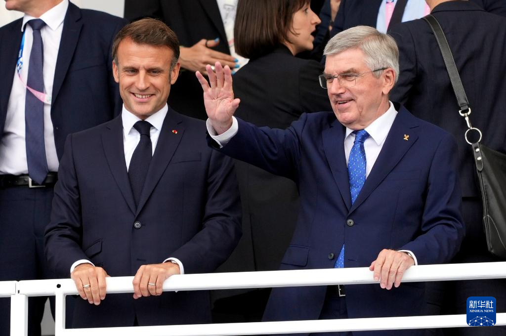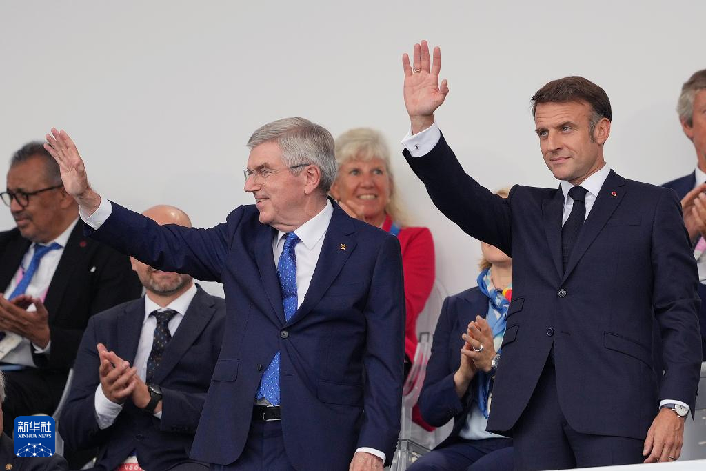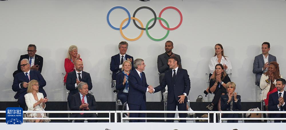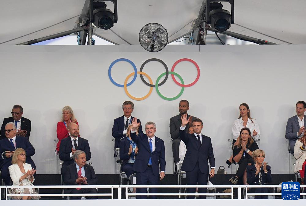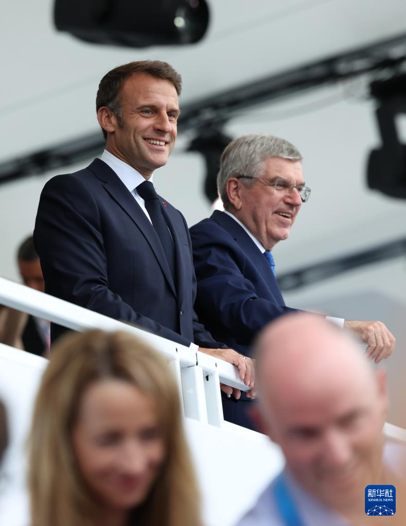 7月26日,国际奥委会主席巴赫(上左)和法国总统马克龙出席开幕式。新华社记者 高静 摄
