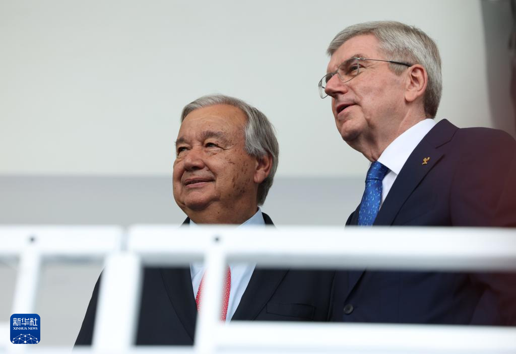 7月26日,国际奥委会主席巴赫(右)与联合国秘书长古特雷斯出席开幕式。新华社记者 高静 摄