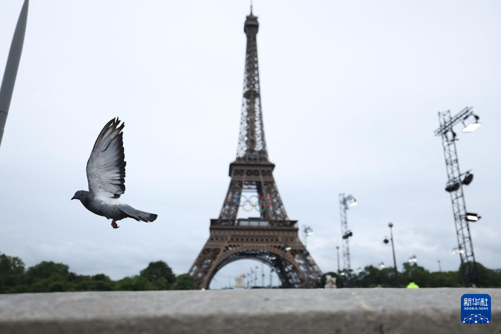 7月26日,一只鸽子在埃菲尔铁塔前飞过。新华社记者 李明 摄