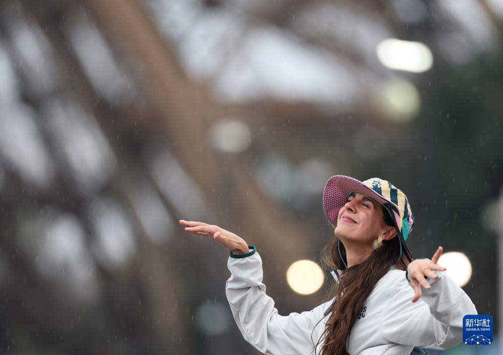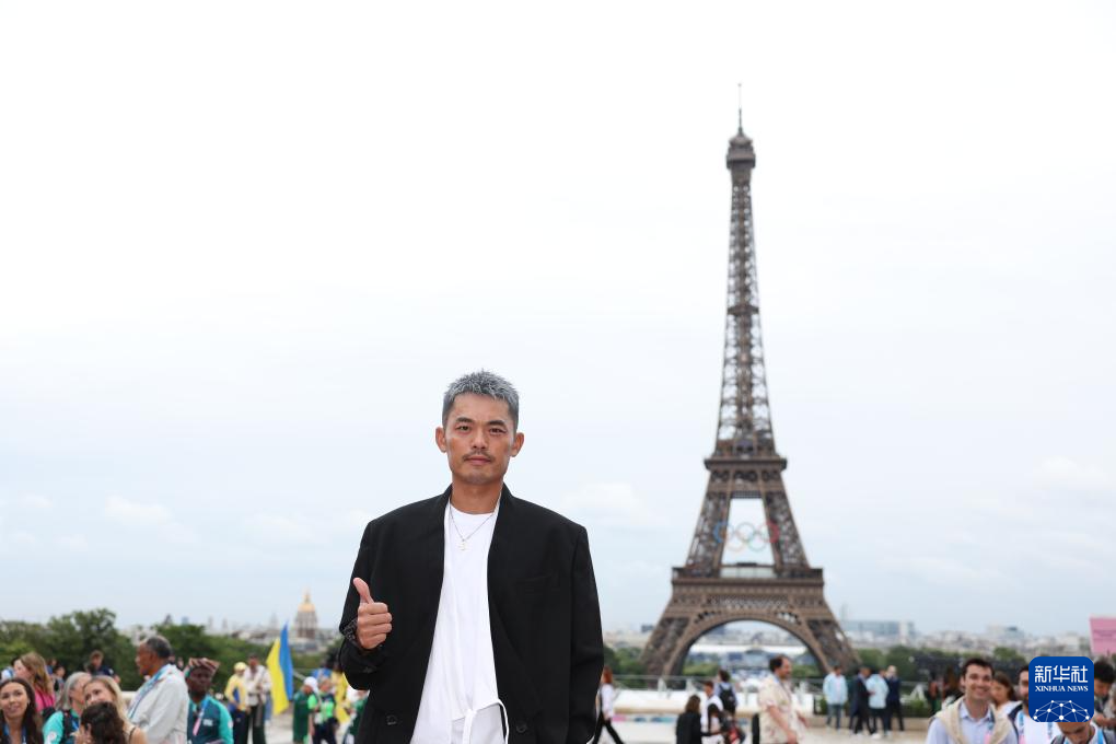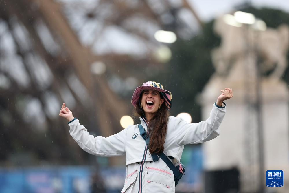 7月26日,一名志愿者在埃菲尔铁塔前起舞。新华社记者 李明 摄