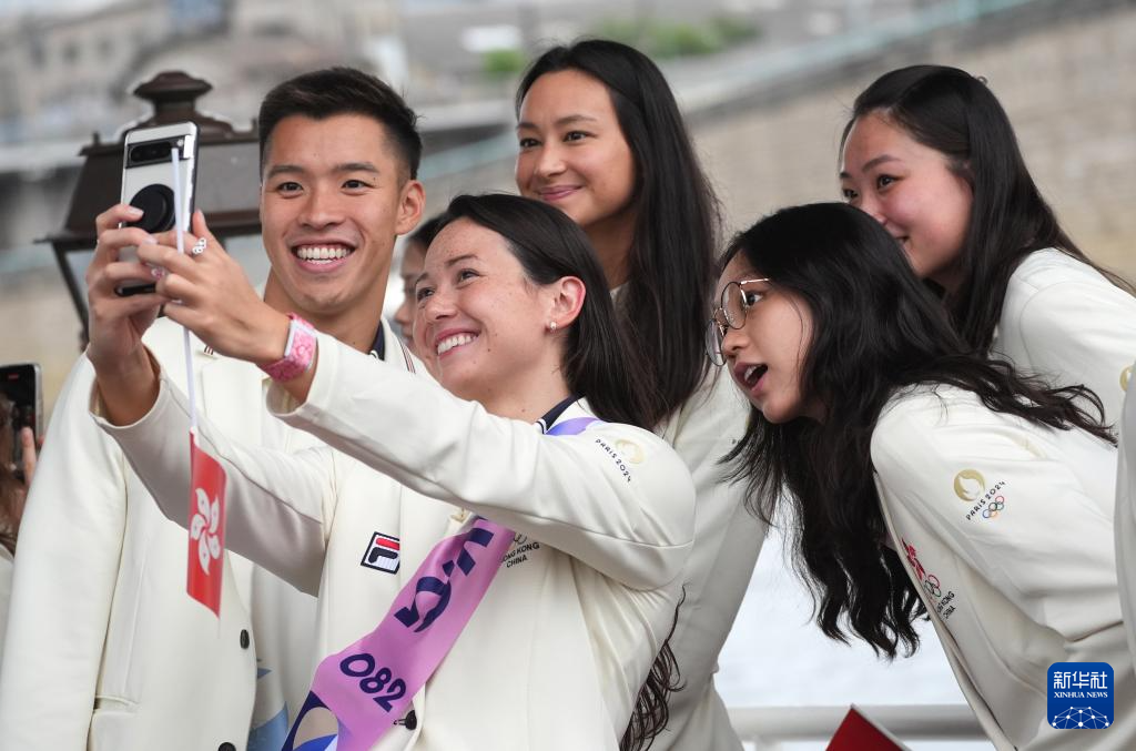 7月26日,中国香港体育代表团成员在开幕式上自拍。新华社记者 吕小炜 摄